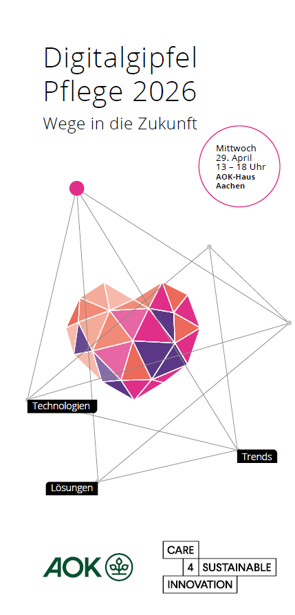 Am 29. April 2026 von 13:00 bis 18:00 Uhr findet im AOK-Haus Aachen (Markt 45–47, 52062 Aachen) der Digitalgipfel Pflege 2026 statt. Die Veranstaltung wird von der AOK Rheinland/Hamburg und dem Projekt Care for Sustainable Innovation (CSI) des Region Aachen Zweckverbands (RAZV) organisiert.