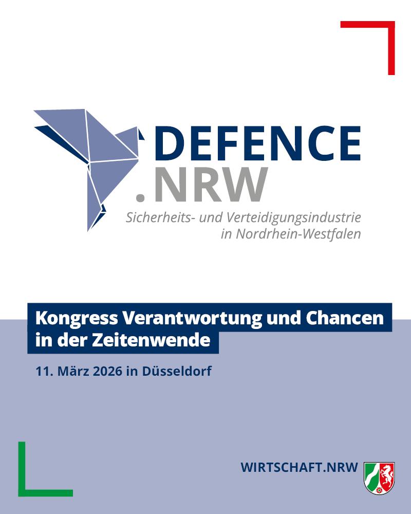 Mit dem Kongress Defence.NRW – Verantwortung und Chancen in der Zeitenwende bringt NRW Akteur:innen aus Politik, Wirtschaft, Wissenschaft und Streitkräften zusammen. Im Fokus stehen sicherheits- und verteidigungspolitische Fragestellungen, technologische Entwicklungen und Kooperationen, die den Standort stärken, Synergien nutzen und neue Impulse für die Branche setzen.